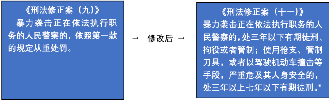 《刑修(十一)》将该款修改为:“暴力袭击正在依法执行职务的人民警察的,处三年以下有期徒刑、拘役或者管制;使用枪支、管制刀具,或者以驾驶机动车撞击等手段,严重危及其人身安全的,处三年以上七年以下有期徒刑。”