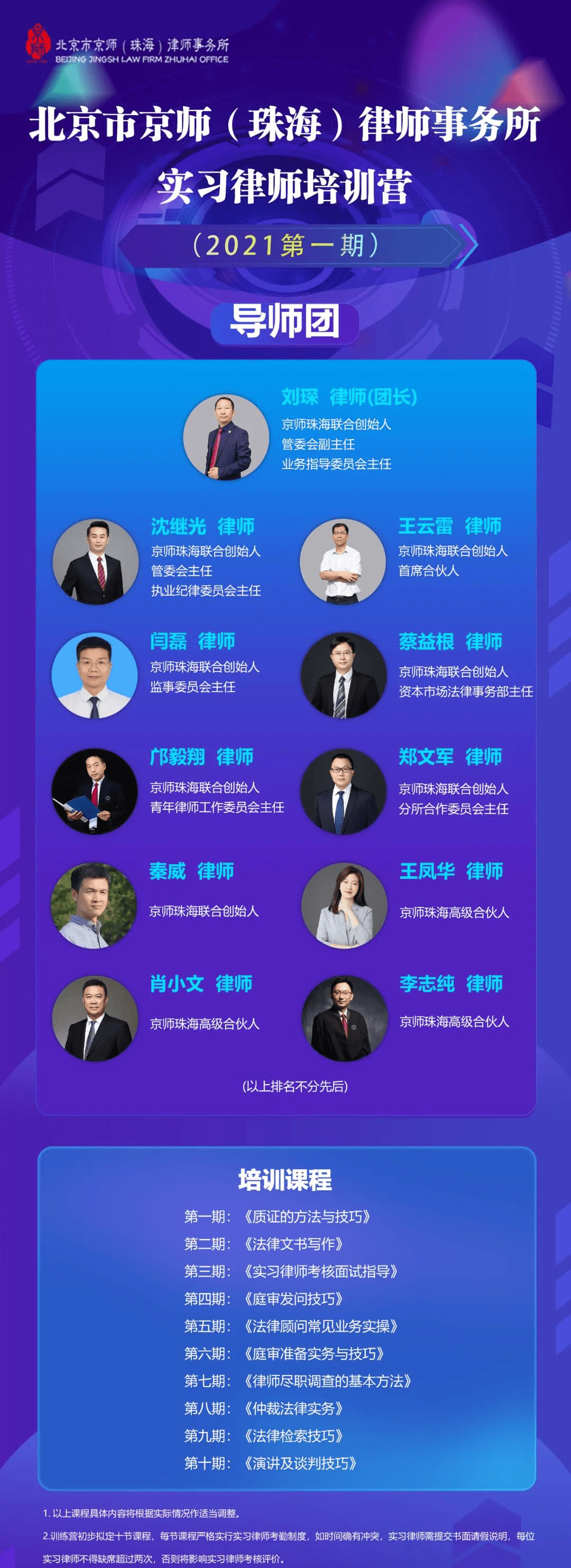 为进一步提升实习律师的各项技能,帮助实习律师快速成长,培养新生代优秀专业律师,为律所提供源源不断的优质法律人才,北京市京师(珠海)律师事务所特成立“京师珠海实习律师培训营(2021年第一期)”并组建“实习律师导师团”。