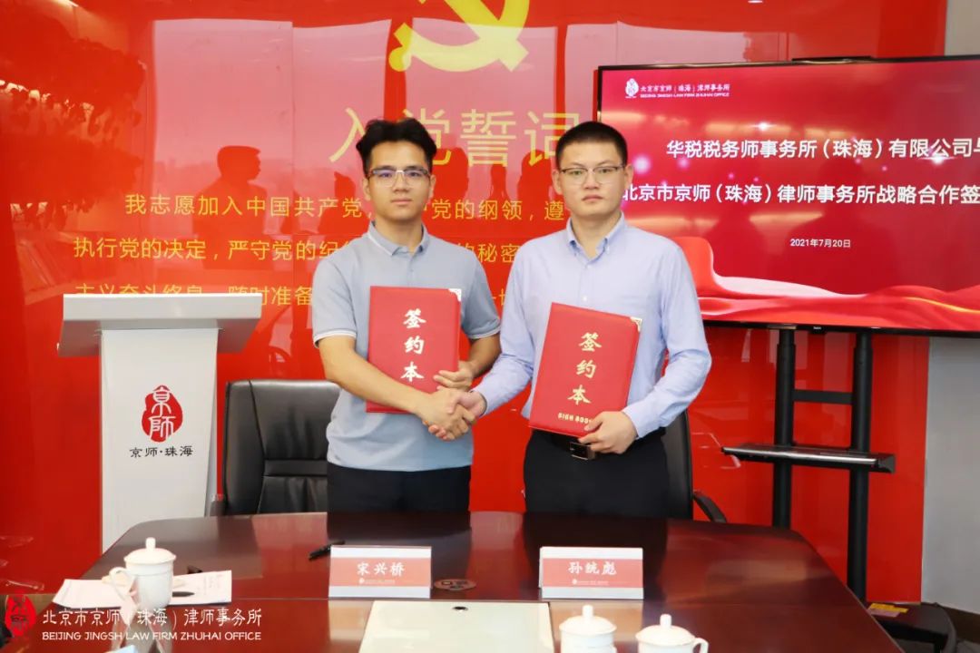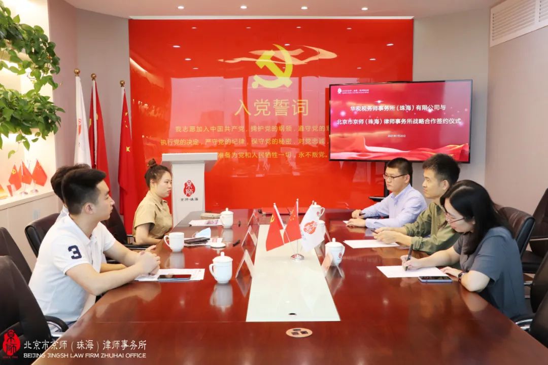7月20日,华税税务师事务所(珠海)有限公司(以下简称“华税珠海”)合伙人、负责人宋兴桥,合伙人梁浚恒,财务总监林智君一行到访北京市京师(珠海)律师事务所(以下简称“京师珠海”)。京师珠海联合创始人、法律研究院院长秦威,执行主任孙统彪,执行副主任郭诗妍等热情接待,双方在党建室开展座谈交流并签订战略合作协议。