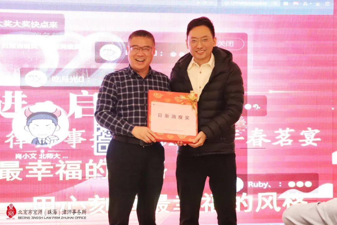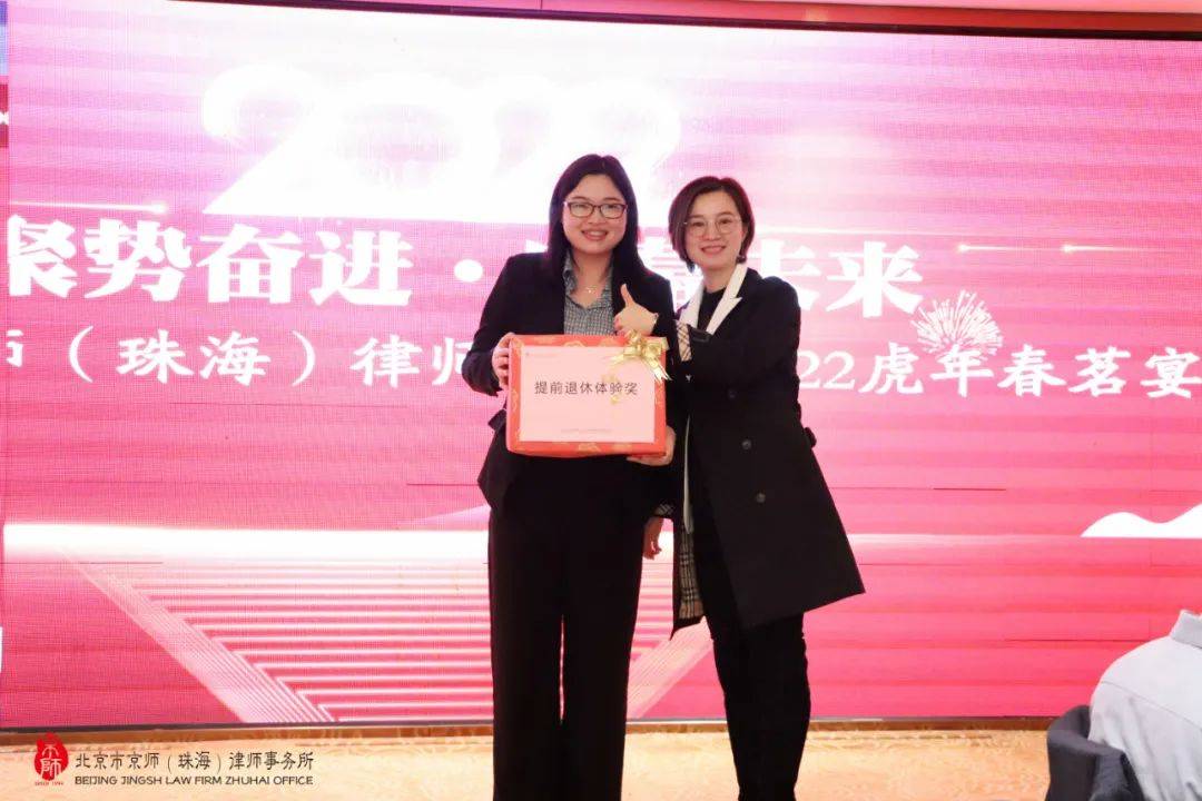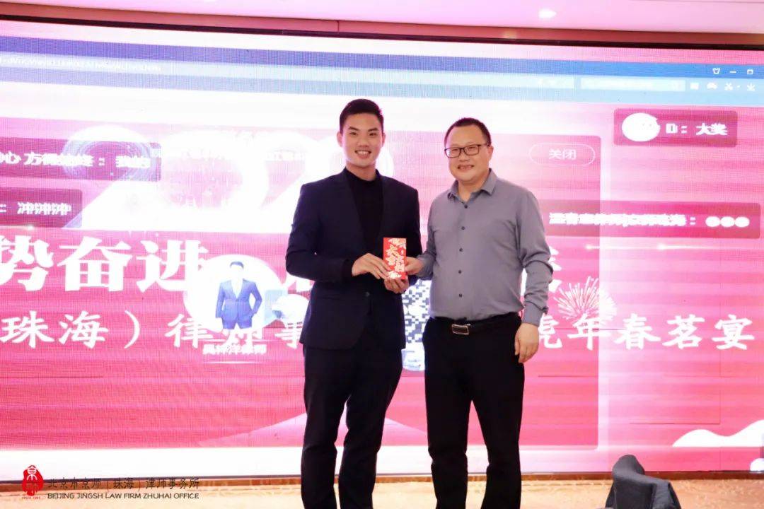 京师珠海律所监委会主任闫磊律师上台祝酒并向全体京师珠海家人们致以新年美好祝福,期待各位同事在2022年凝心聚力、不断突破,持续加强全方位专业化建设,向成为大湾区律所标杆的目标前进。祝愿大家虎年虎虎生威、身体健康、万事胜意、吉祥安康。