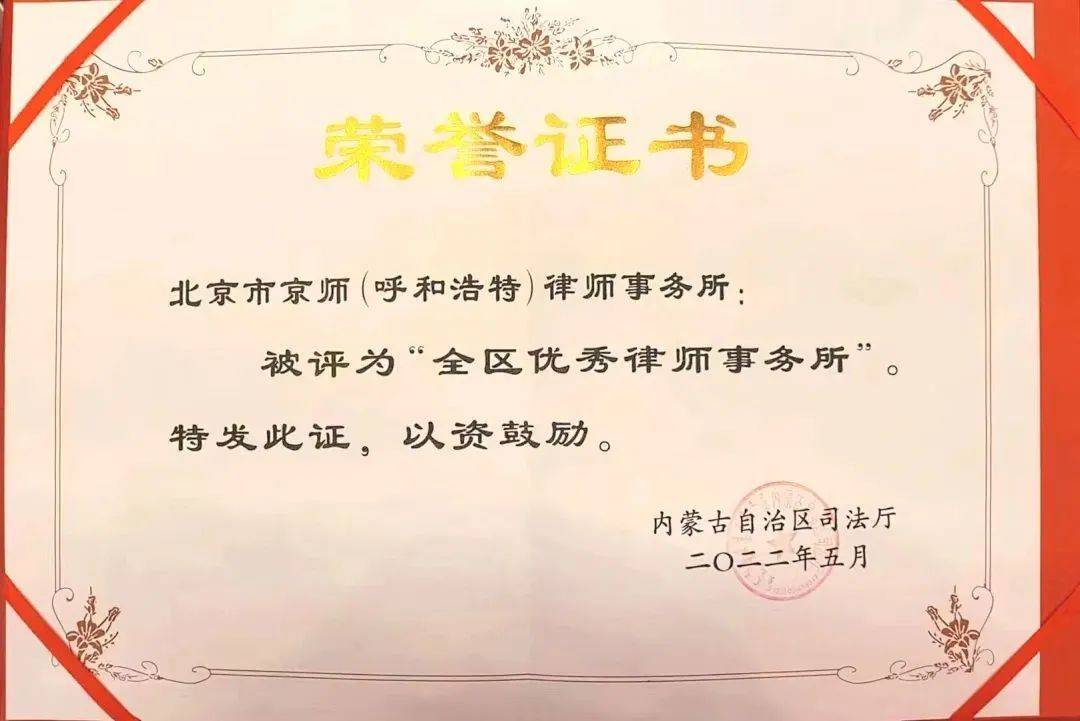 2022年5月31日,内蒙古自治区第十次律师代表大会上,北京市京师(呼和浩特)律师事务所荣获内蒙古自治区优秀律师事务所,这是对于京师律所发展的高度肯定,也是对每一位京师同仁专业能力的认可与嘉奖。京师律所将继续砥砺前行,提供更加专业的法律服务,同时积极践行社会责任,为社会发展贡献力量!