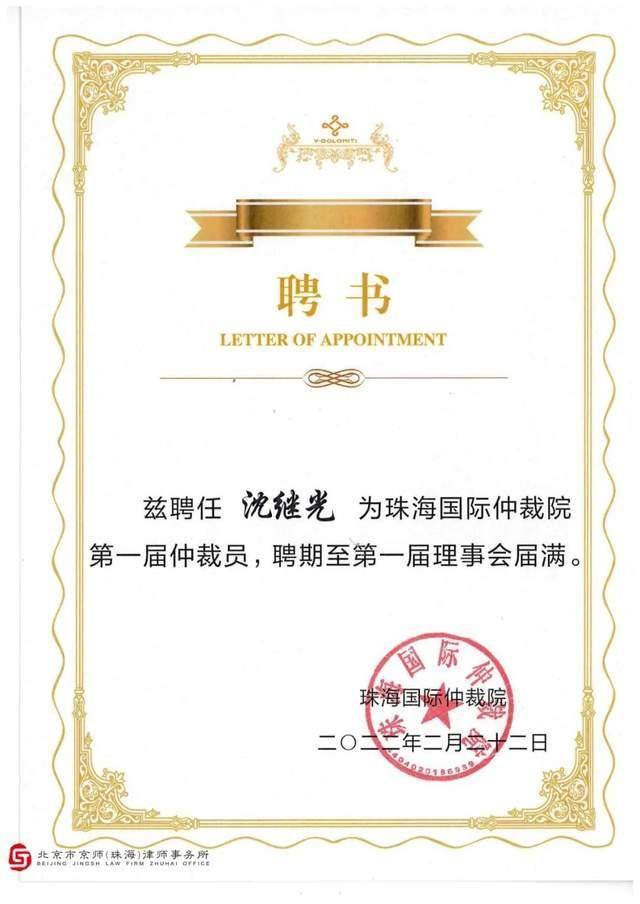 沈继光律师作为在民商事争议解决领域具有丰富经验的律师,本次入选珠海国际仲裁院第一届仲裁员,是对其法律素养与职业能力的肯定。沈继光律师将充分发挥专业特长,独立、公正、公平、勤勉地做好仲裁工作,妥善处理社会矛盾,推进多元化争议解决机制的构建,为合作区商事主体提供优质高效的仲裁、调解服务,为促进经济的正常运行作出贡献。
