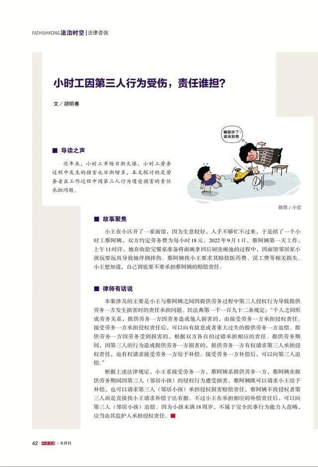 近日,京师合肥律所胡明春律师撰写的《小时工因第三人行为受伤,责任谁担?》一文被《江淮法治》杂志选用刊发。