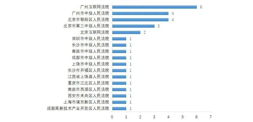 从表2和表3可看出,具体审理法院为:深圳市中级人民法院1案,广州互联网法6案,广州市中级人民法院4案,北京市朝阳区人民法院4案,北京市第三中级人民法院3案,北京互联网法院2案,其余案件主要分布在江西、四川、湖南、陕西、重庆及上海。