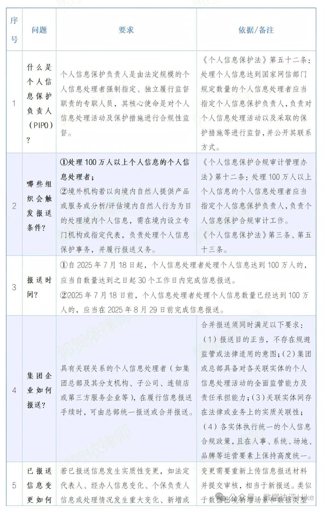 前言:2025年7月18日,国家网信办正式发布《关于开展个人信息保护负责人信息报送工作的公告》(以下简称“公告”),明确指出处理100万人以上个人信息的个人信息处理者,应当依法向所在地设区的市级网信部门报送个人信息保护负责人情况及个人信息处理相关情况。