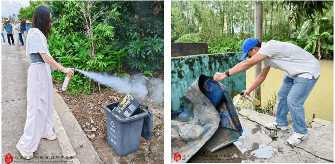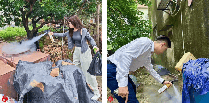在蚊虫孳生地治理环节,聚焦排水沟、闲置花盆、轮胎、水桶等积水容器,逐一进行彻底清理。大家分工协作,或俯身倾倒积水,或用刷子细致清洗容器内壁以清除蚊卵,对难以清除的积水区域则配合专业人员精准喷洒灭蚊药剂,从源头切断“两热”传播链条。