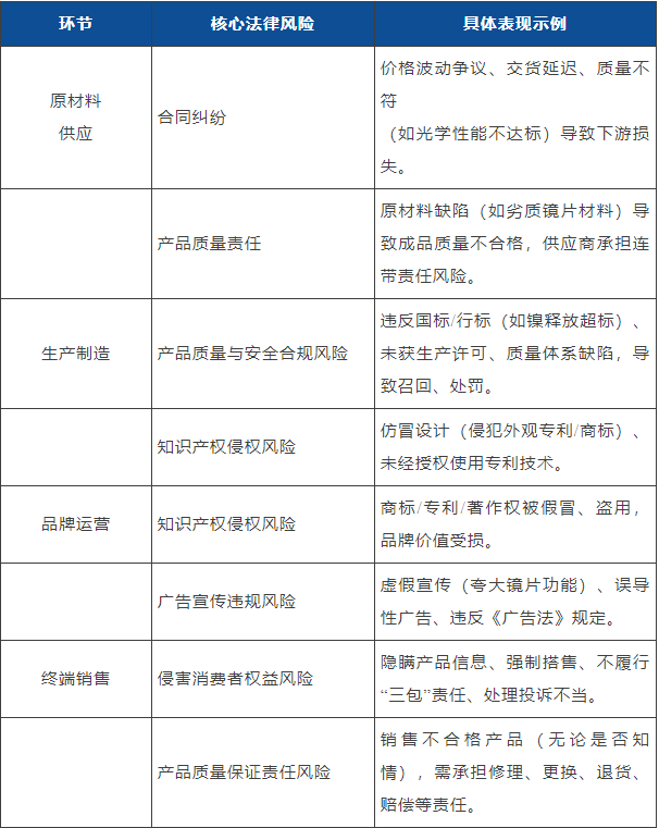 法律焦点:产品质量与安全法规(度数精准、透光率、结构稳定性、有害物质限量如镍释放)、知识产权风险(设计侵权)、生产资质许可(如生产许可证)。