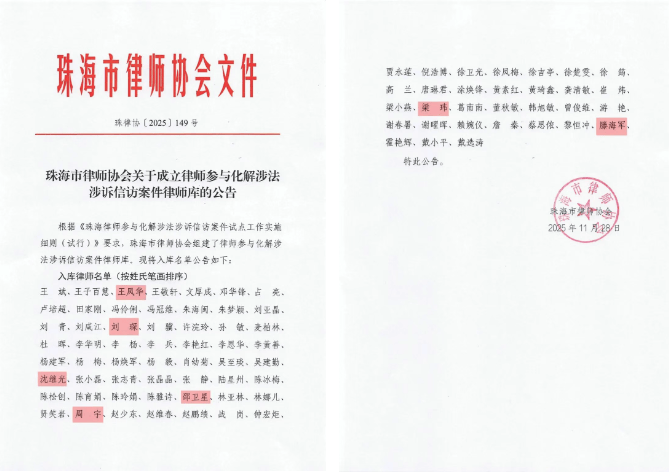 北京市京师(珠海)律师事务所(以下简称“京师珠海律所”)联合创始人沈继光、刘琛、周宇、王凤华、梁玮,企业重组与破产清算法律事务部(拟)主任邵卫星以及刑事法律事务部研究员滕海军7位律师,凭借过硬的政治素养、深厚的专业功底与丰富的实务经验成功入选珠海市“律师参与化解涉法涉诉信访案件”律师库,充分彰显了京师珠海律所在社会治理与公益法律服务领域的综合实力。