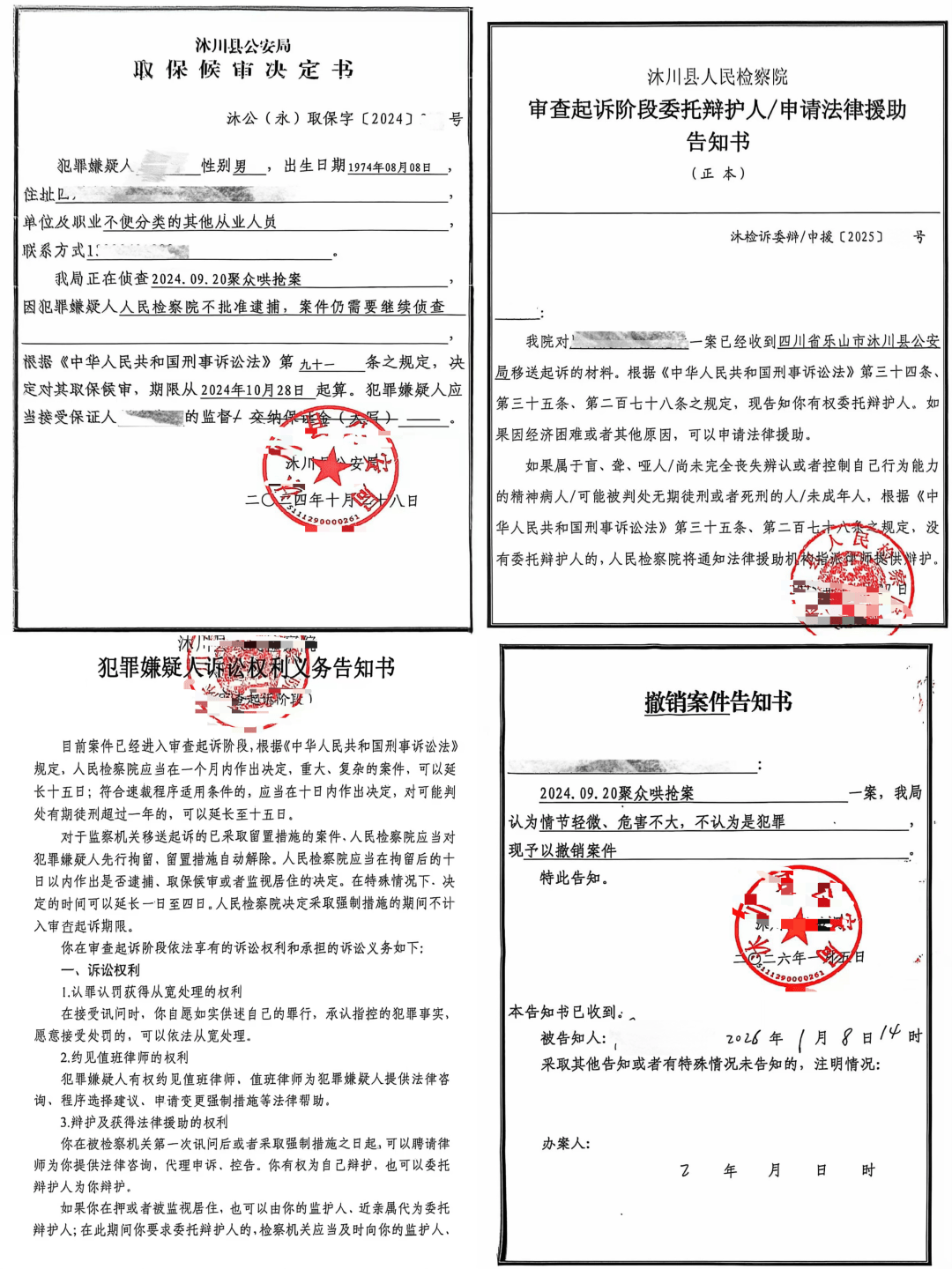 检察机关经全面审查案卷材料、核实相关证据,充分采纳了辩护律师的辩护意见,认定本案系民事合同纠纷引发的争议,周某某的行为不符合聚众哄抢罪的构成要件,不具备刑事追诉的必要性。最终,检察机关依法将案件退回公安机关,公安机关作出撤销案件的决定,向当事人周某某送达《撤销案件告知书》,这场历时两年的刑事指控终告终结,周某某的合法权益得到有力维护。