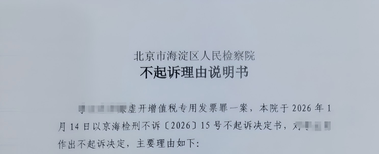 2026年1月14日,北京市某区人民检察院作出不起诉决定书(京某检刑不诉[2025] 1096 号),至此,由北京市京师律师事务所沈理新律师承办的李某某涉嫌“虚开增值税专用发票罪”一案,经过14个月的坚守与陪伴,终于尘埃落定。