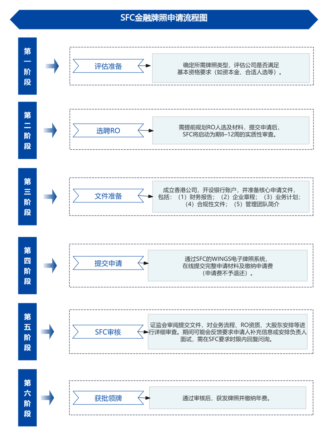 尽管SFC在处理时限上承诺过公司牌照申请需15周,代表申请需8周,RO申请需10周[10],但实际处理时间仍可能会因文件完整性、SFC查询响应、资本注入时间、SFC工作量等因素延长至6-12个月,一般整个流程通常需要6-8个月。