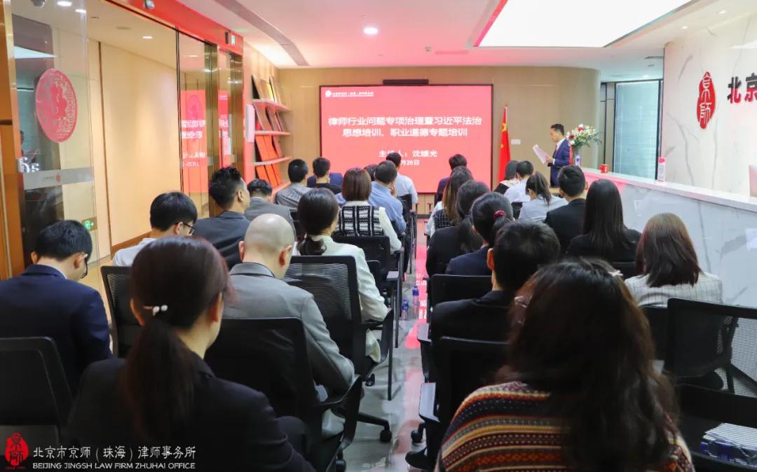 北京市京师(珠海)律师事务所深入学习贯彻法治思想,积极响应司法局、律协号召,认真部署律师行业突出问题专项治理工作,积极引导依法规范执业、诚信执业、防范执业风险,发挥律师在维护社会稳定和促进经济发展中的重要作用。