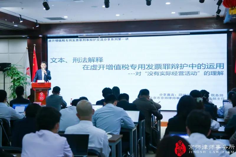 2021年4月20日,《文本、刑法解释,在虚开增值税专用发票罪刑事辩护中的运用》系列讲座第一讲在京师律师大厦一楼大讲堂顺利举办。本次讲座主讲人为京师律师事务所税务法律事务部主任邱继岩,并特邀京师(全国)刑事专业委员会副主任马里担任主持人,更有神秘嘉宾——京师全国业务指导委员会常务副主任陈海阳助阵。