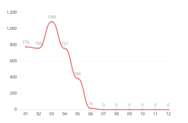 通过分析数据得知,本报告样本的案件在2021年上半年的审结情况为:1月份有776件;二月份有760件;三月份有1089件;四月份有757件;五月份有386件;六月份有16件,七月份至今暂未有已审结案件。
