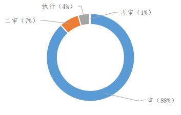 通过分析数据得知,本报告样本中:一审终审案件有3338件,占比88%;二审终审案件有275件,占比7%;再审案件有14件,占比1%;执行案件有157件,占比4%。