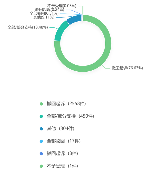 通过分析数据得知,本报告样本的一审裁判结果中:原告被驳回起诉的案件有8件,占0.24%;原告撤回起诉的案件有2558件,占76.63%;原告诉求被全部或部分支持的案件有450件,占比13.48%,诉讼请求被全部驳回的案件有17件,占比0.51%;获得其他裁判结果的案件有304件,占比9.11%;案件不予受理的仅有1件,占比0.03%。