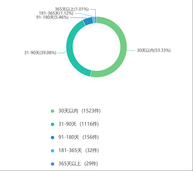 通过分析数据得知,本报告样本的案件审理期限分为五类:在30天内审结案件有1523件,占比53.33%;在31-90天内审结案件有1116件,占比39.08%;在91-180天内审结的案件有156件,占比5.46%;在181天-365天内审结案件的有32件,占比1.12%;在365天以上审结的案件有29件,占比1.01%。