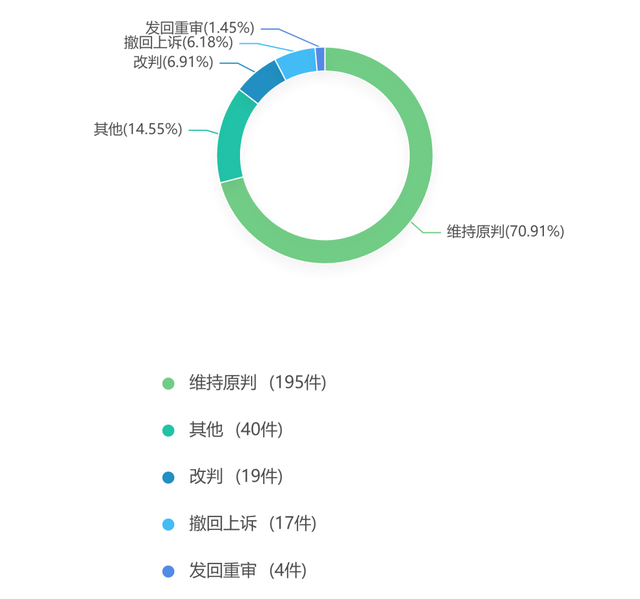 通过分析数据得知,本报告样本的二审裁判结果中:法院维持原判的案件有195件,占70.91%;法院改判的案件有19件,占比6.91%;撤回上诉的案件有17件,占比6.18%;其他结果的案件有40件,占比14.55%;发回重审的案件有4件,占比1.45%。