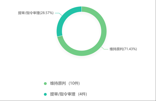 通过分析数据得知,本报告样本的再审裁判结果中:再审案件共有14件,其中有10件以维持原判审结,4件以提审/指令审理审结。