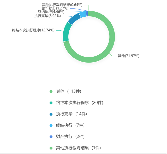 通过分析数据得知,本报告样本的执行裁判结果中:终结执行的案件有7件,占比4.46%;财产执行的案件有2件,占比1.27%;终结本次执行程序的案件有20件,占比12.74%;处以其他结果的案件有113件,占比71.97%;执行完毕的案件有14件,占比8.92%;其他执行裁判结果的案件有1件,占比0.64%。