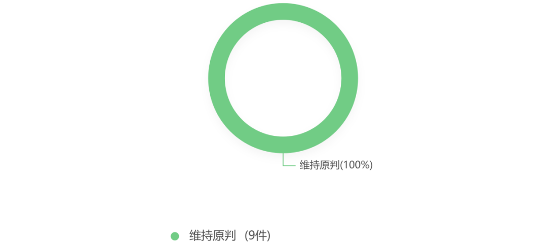 通过分析数据得知,本报告样本的案件二审裁判结果情况为: 在进入二审阶段的案件中,维持原判的案件有13件,占比61.9%; 处以其他结果的案件有4件,占比19.05%; 上诉人撤回上诉的案件有3件,占比14.29%; 得以改判的案件有1件,占比4.76%。