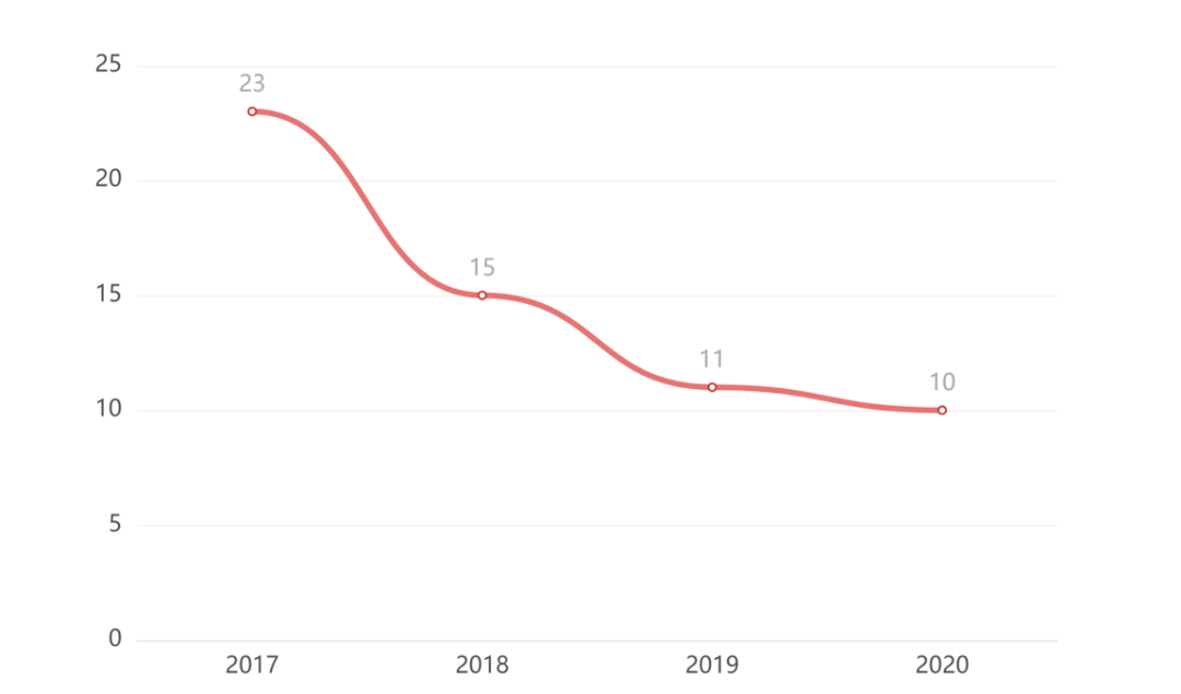 通过分析数据得知,本报告样本的案件在近四年(2017年至2021年11月)的审结情况为:2017年有23件;2018年有15件;2019年有11件;2020年有10件。上述省市在2021年尚未有相关案例。