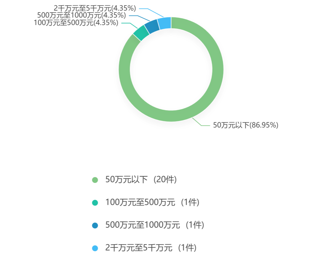 通过分析数据得知,本报告样本的标的额情况为:标的额在50万元以下的案件有20件,占比86.95%;标的额在100万元至500万元、500万元至1000万元、2千万元至5千万元间的案件均仅有1件,占比4.35%。