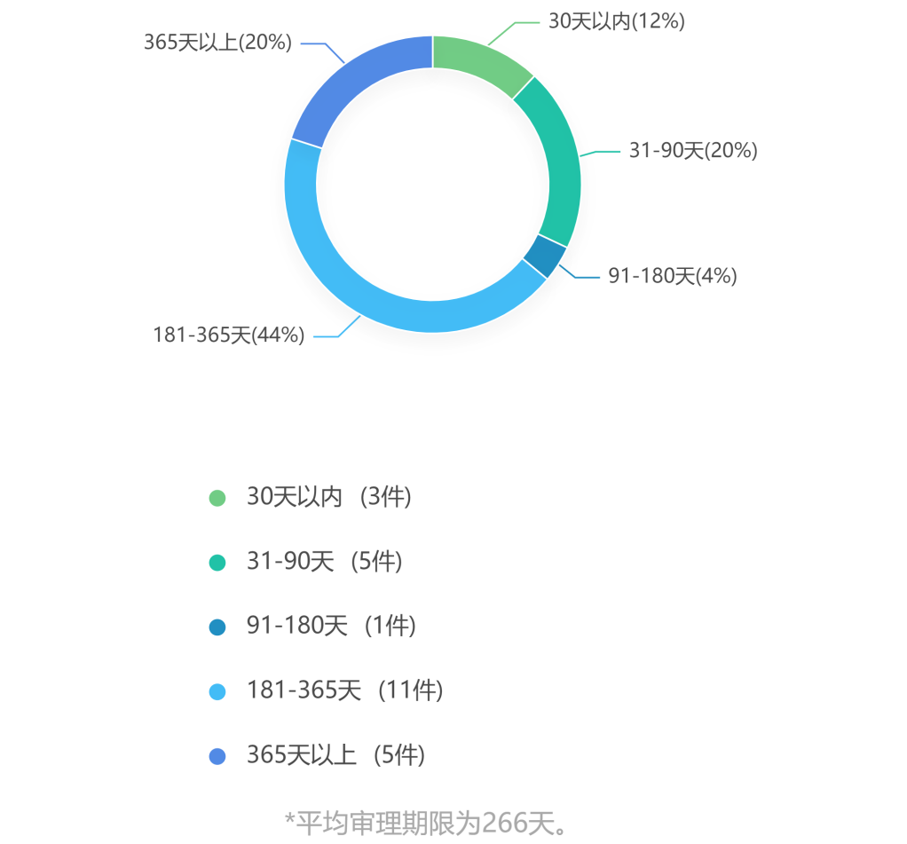 通过分析数据得知,本报告样本的案件审理情况为:在30天以内得以审结的案件有3件,占比12%;在31-90天审结的案件有5件,占比20%;在91-180天审结的案件仅有1天,占比4%;181-365天审结的案件有11件,占比44%;365天以上审结的案件有5件,占比20%。 总体上来看上述重点省市对于垄断协议纠纷主要通过诉讼来解决,审理期限主要集中在181天以上,平均审理期限为266天,其原因归于垄断本身受到经济活动的影响较大,具有复杂因素,难以直接认定。