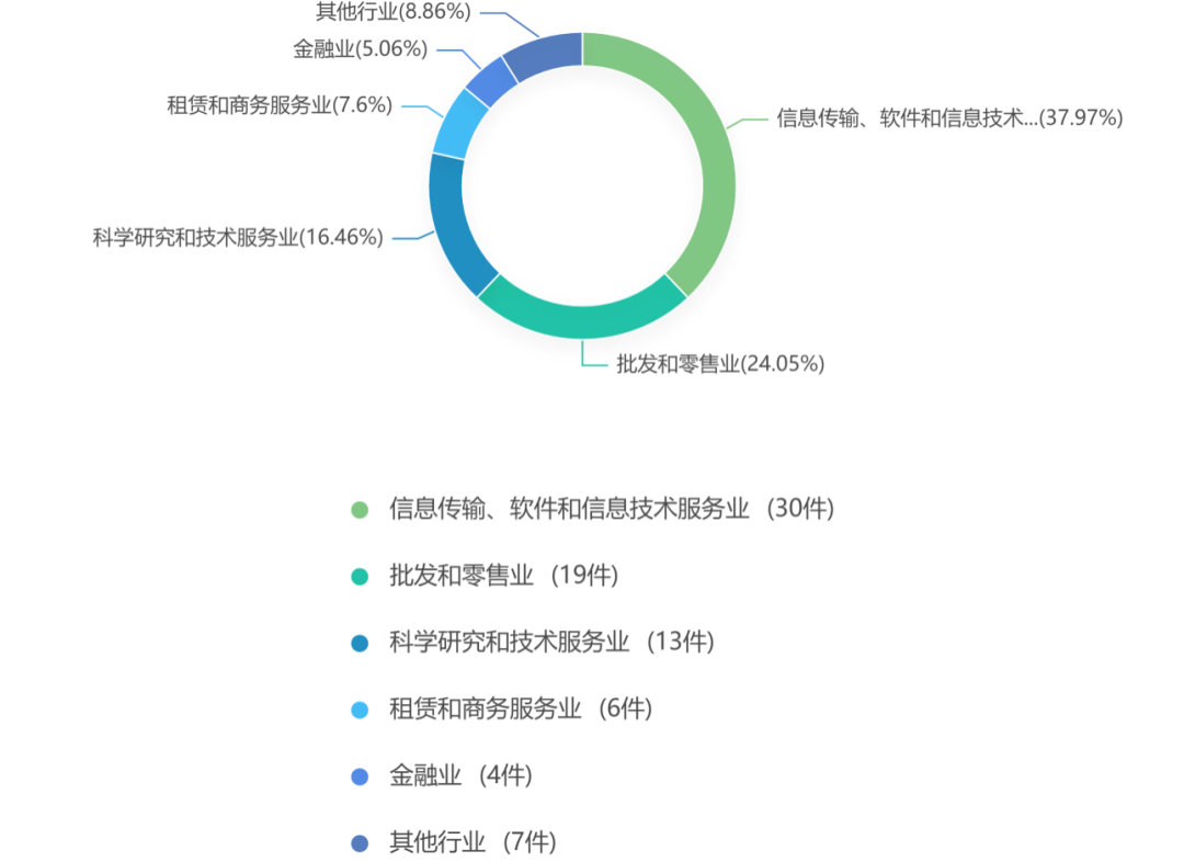 通过分析数据得知,本报告样本中涉及垄断协议纠纷的行业分布情况为:当事人涉及信息传输、软件和信息技术服务业的案件有30件,占比37.97%;当事人涉及批发和零售业的案件有19件,占比24.05%;当事人涉及科学研究和技术服务业的案件有13件,占比16.46%;当事人涉及到租赁和商务服务业的案件有6件,占比7.6%;当事人涉及金融业的案件有4件,占比5.06%;当事人涉及其他行业的案件有7件,占比8.86%。