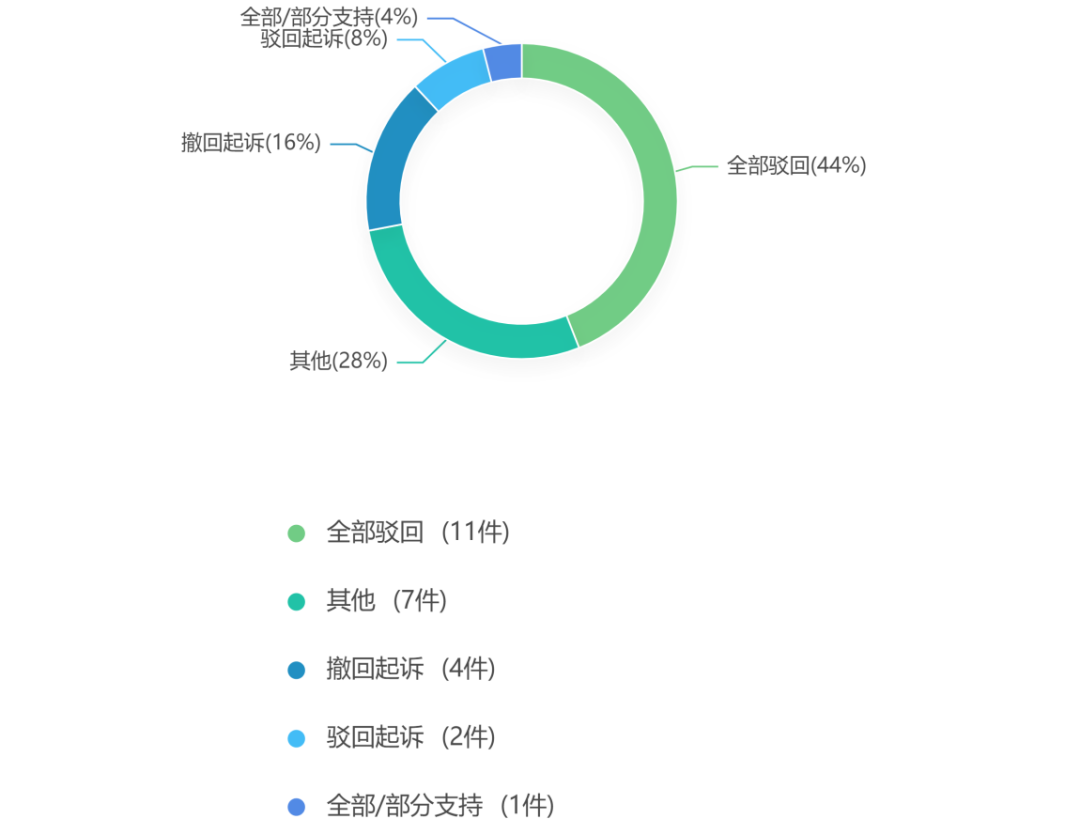 通过分析数据得知,本报告样本的案件裁判结果情况为: 诉求被全部或部分支持的案件仅有1件,占比4%; 裁判为其他结果的案件有7件,占比28%; 当事人撤回起诉的案件有4件,占比16%; 诉求被全部驳回的案件有11件,占比44%; 驳回起诉的案件有2件,占比8%。