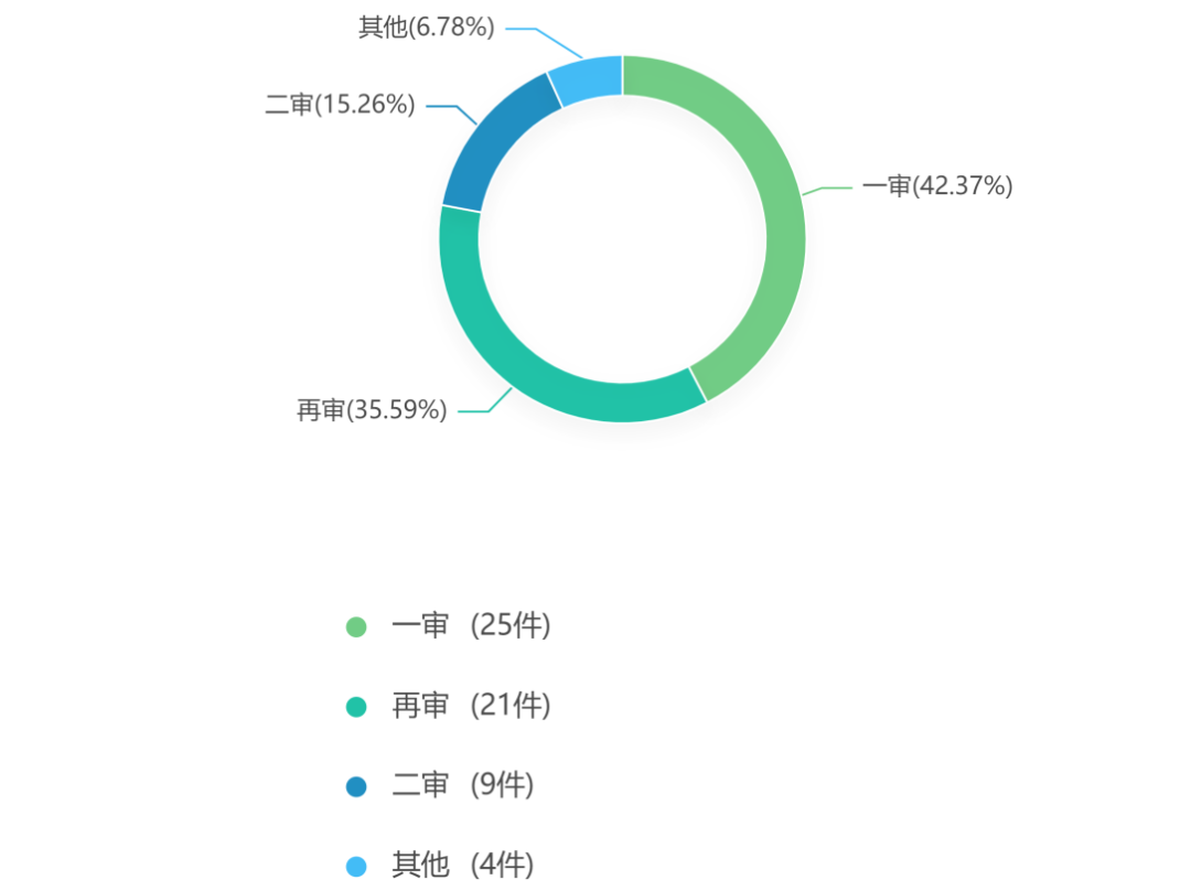 通过分析数据得知,本报告样本中:一审的案件有25件,占比42.37%;二审的案件有9件,占比15.26%;再审的案件有21件,占比35.59%;适用其他程序的案件有4件,占比6.78%。 总体上看,上述重点省市在垄断协议纠纷的处理主要是采用了诉讼的方式,可见,垄断协议纠纷更依赖于法律途径来解决矛盾,另有部分案件启动了其他程序。