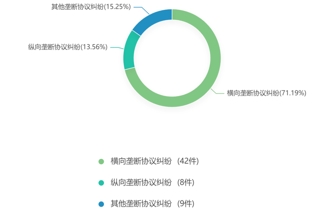 通过分析数据得知,本样本中的垄断协议纠纷在案由分类上,主要有三类:横向垄断协议纠纷的案件有42件,占比71.19%;纵向垄断协议纠纷的案件有8件,占比13.56%;其他垄断协议纠纷的案件有9件,占比15.25%。可见横向垄断协议纠纷在垄断协议纠纷属于高发类型。