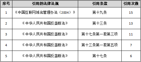 通过分析数据得知,本报告样本中,《中国互联网域名管理办法(2004)》第十九条被引用次数最多,为15次。另,与垄断协议相关的法律法规也被多次引用,如《中华人民共和国反垄断法》。该类纠纷案件在实践中虽存在一些难点,但所适用的实体法较为单一。