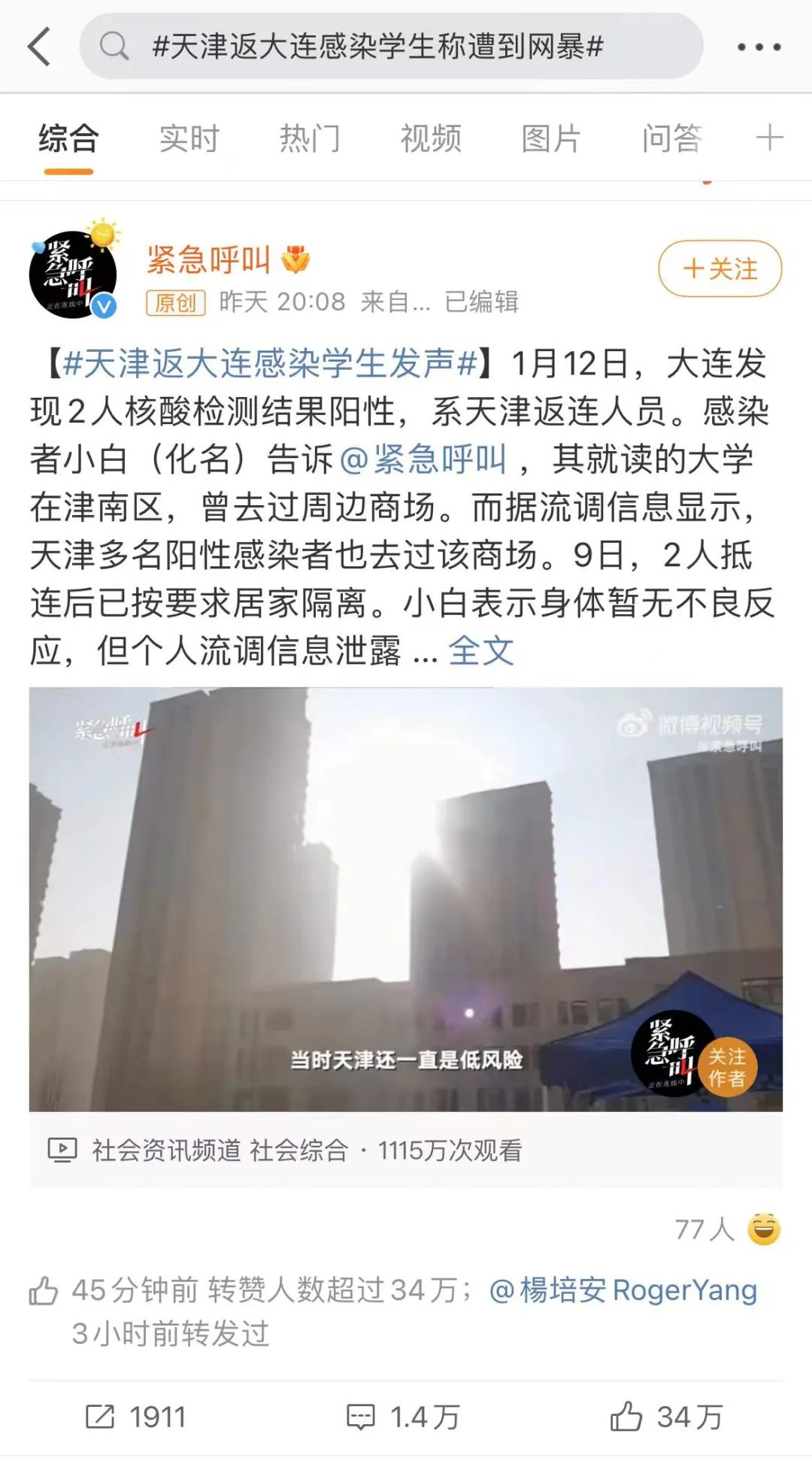 (4)天津返大连感染学生发声:身体暂无不良反应,但个人流调信息泄露遭到网暴,她和家人承受很大压力。