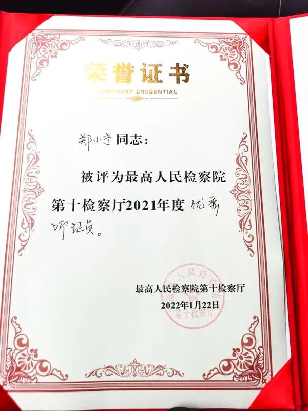 ▲郑小宁律师被授予“最高人民检察院第十检察厅2021年度优秀听证员”荣誉称号