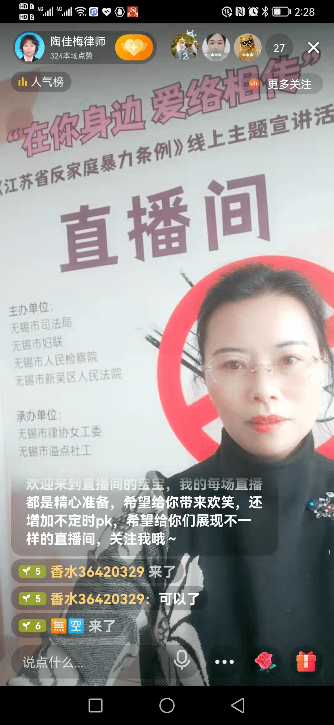 3月1日,为了预防和制止家庭暴力,弘扬家庭美德,由无锡市司法局、市妇联、市检察院、新吴区法院主办,市律协女工委、溢点社工承办的《江苏省反家庭暴力条例》线上主题宣讲活动在各平台直播。我所李芳芳律师、陶佳梅律师轮番解读该条例。