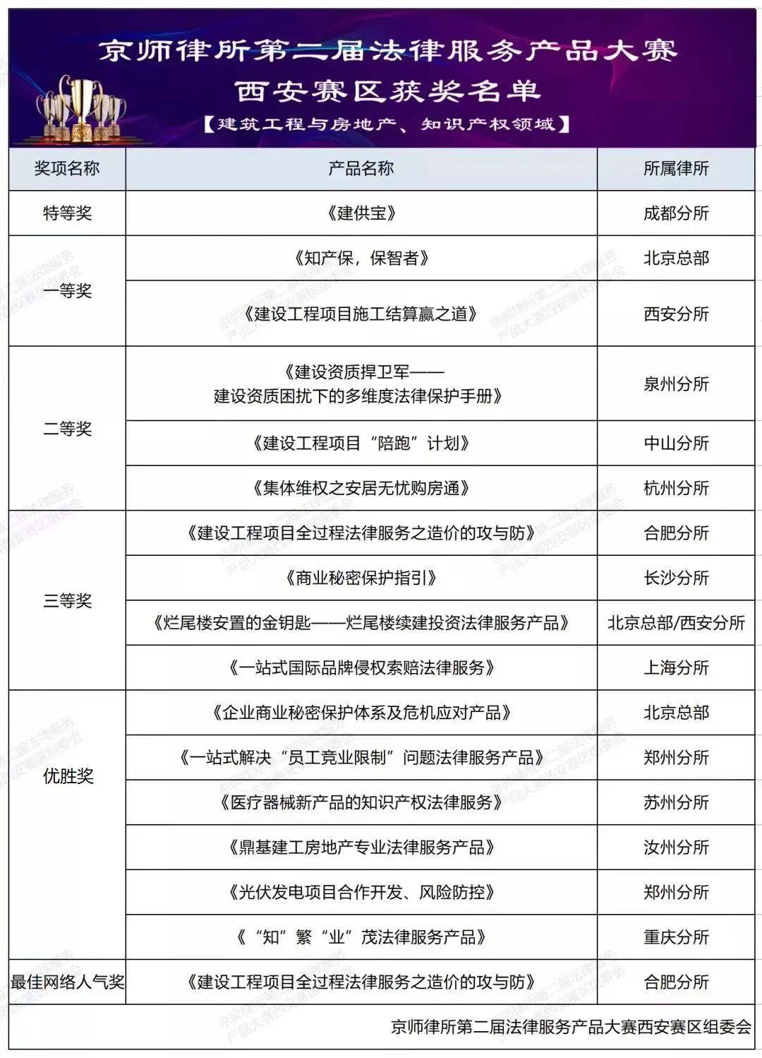 2022年3月12日,京师律所第二届法律服务产品大赛西安赛区(建筑工程与房地产、知识产权领域赛区)决赛隆重举行。本次决赛,来自京师律所体系共16件法律产品历经初审、复审脱颖而出,汇聚于华夏故都、文明之源——西安,在大西安建设、国家中心城市建设、国际化大都市建设的历史交汇期、黄金机遇期,京师律师在西安这座辉煌之都刮起竞技之风,在一带一路国家倡议上共谋全新发展!秦之锐士、法之先锋;王者争霸、闪耀长安!