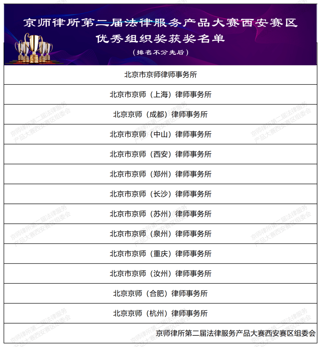 为致谢参赛分所的辛勤付出,西安赛区组委会为各个分所颁发最佳组织奖奖状及奖杯。
