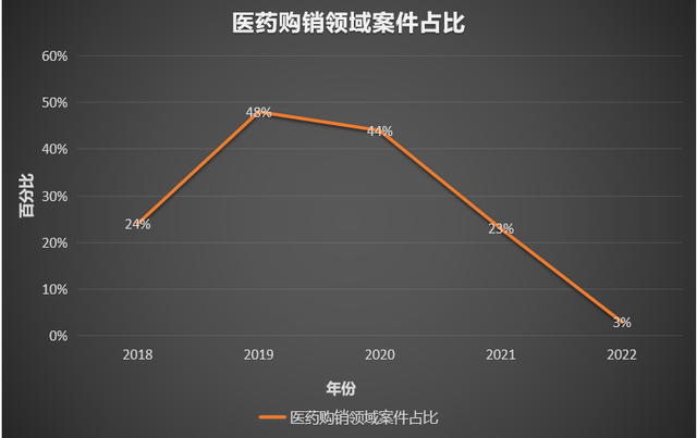 医药购销领域一直是商业贿赂执法重点监管领域,根据公开渠道查询的案例数据汇总,2018年到2022年5与月份目前为止医药购销领域的案件(包括医药、医疗器械、医疗美容、临床试验等)在全年占比分别为:24%、48%、44%、23%、3%。(如下图)。