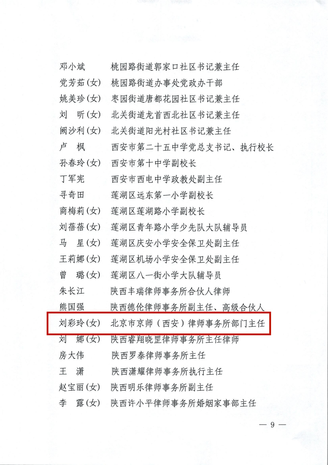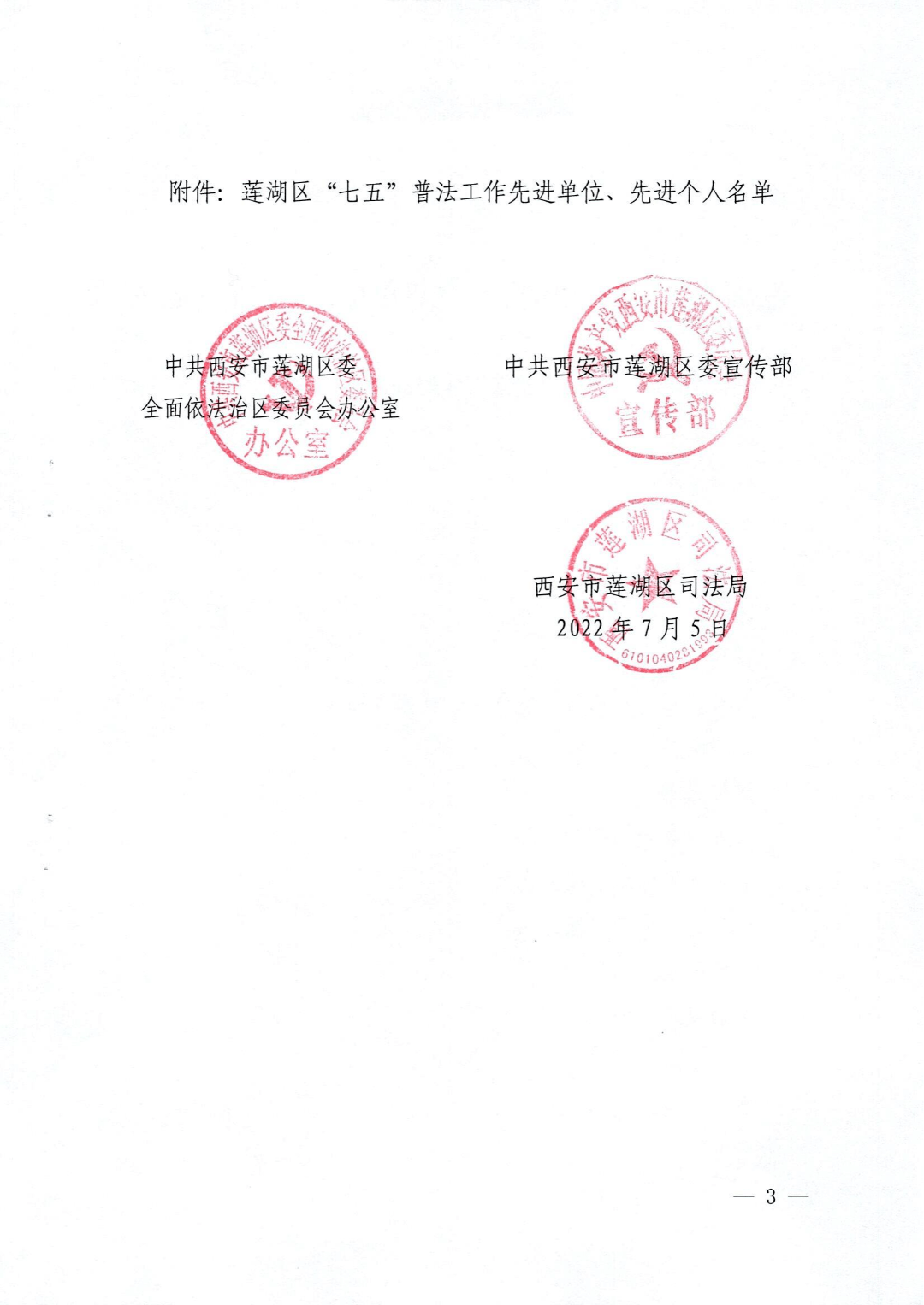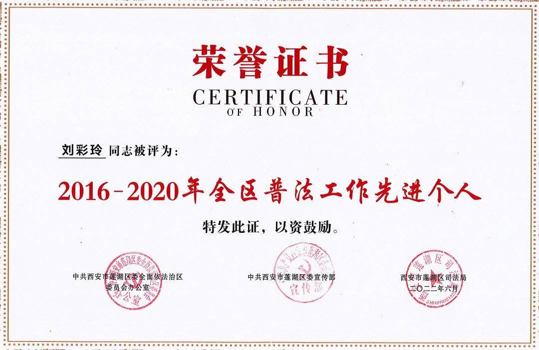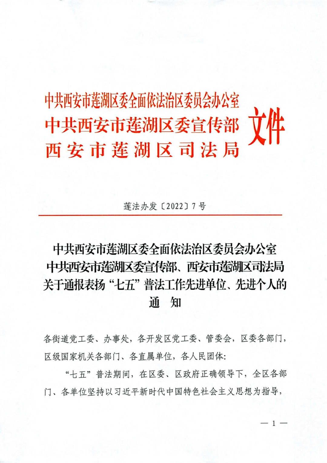 近日,中共西安市莲湖区委全面依法治区委员会办公室、中共西安市莲湖区委宣传部、西安市莲湖区司法局下发关于通报表扬“七五”普法工作先进单位、先进个人的文件。北京市京师(西安)律师事务所获评莲湖区“七五”普法工作先进单位。京师西安律所执行主任刘彩玲律师获评莲湖区“七五”普法工作先进个人。
