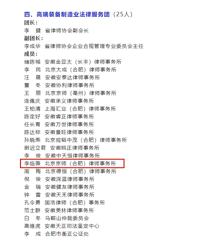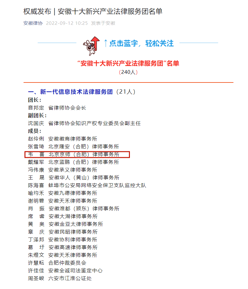 2022年9月12日,安徽省律师协会公布了“安徽十大新兴产业法律服务团名单”。北京京师(合肥)律师事务所第一党支部组织委员韦喜律师入选“新一代信息技术法律服务团”,北京京师(合肥)律师事务所青年律师工作委员会委员李临薇律师入选“高端装备制造业法律服务团”。这是对我所律师工作能力及专业水准的充分肯定。