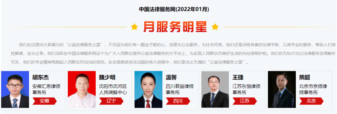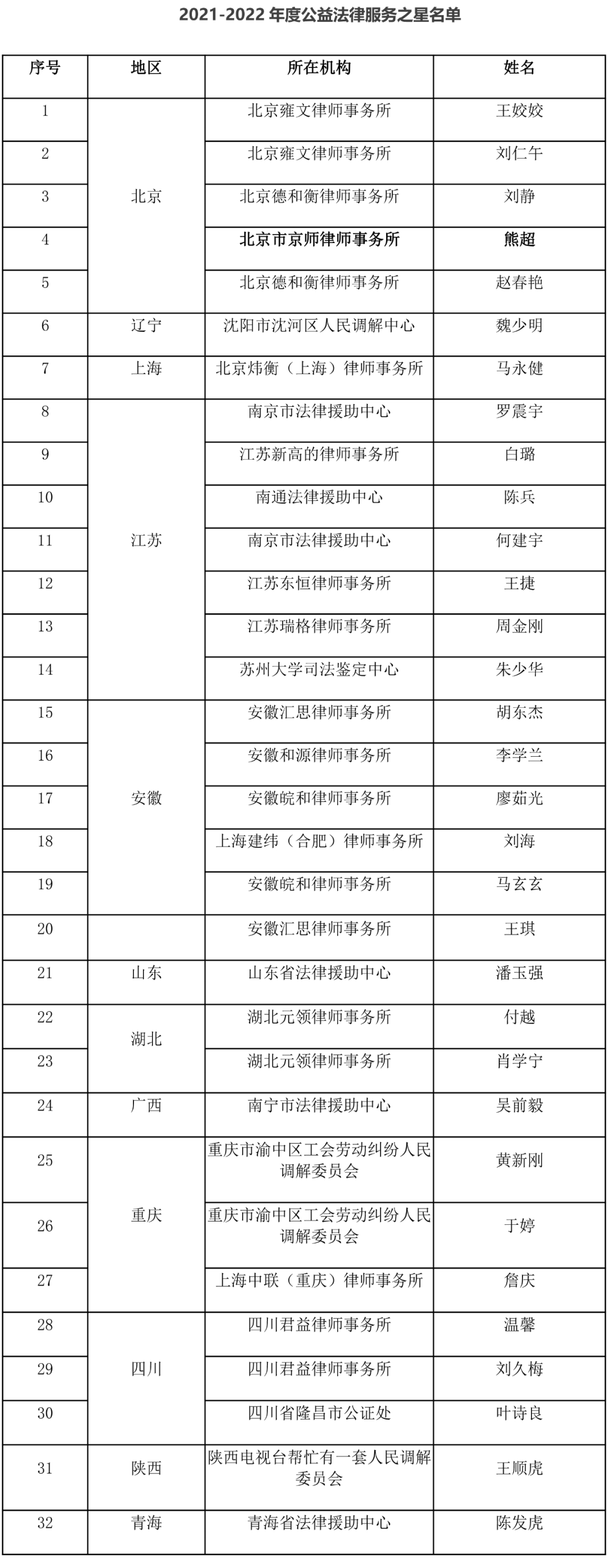 日前,司法部法律援助中心组织开展2021-2022年度公益法律服务之星评比活动,评选出32名“公益法律服务之星”。其中,北京市五名法律工作者当选,京师律所熊超律师继荣获“月服务明星”后,再次获得“年度服务之星”称号。