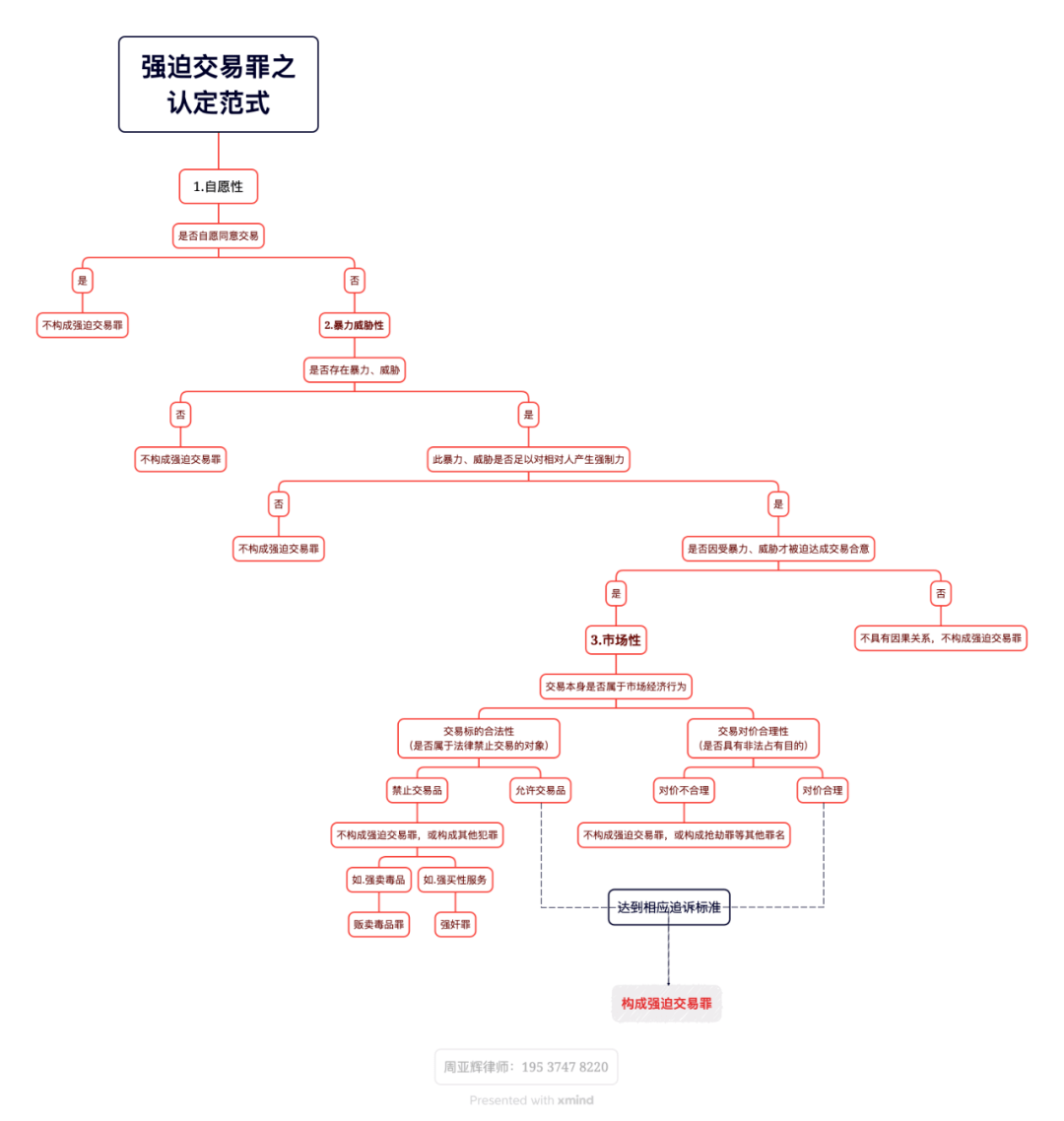 综合以上理论、规定与案例,笔者总结强迫交易罪之认定范式如下图: