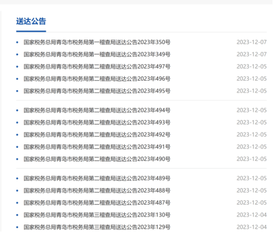 根据《中华人民共和国税收征收管理法实施细则》第一百零六条第(二)款之规定,因采用其他方式无法向企业送达税务文书,税务局可以公告送达。下图为近期国家税务总局青岛市税务局官网涉税公告中的送达公告截图,每个送达公告背后都代表至少一家被稽查或被行政处罚的企业。