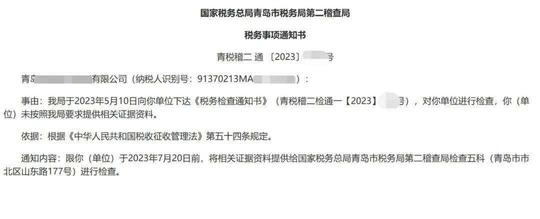 下图为青岛市税务局的对于青岛xx有限公司税务检查的税务事项通知书,我们可以看到,该企业第一次未配合提供证据资料,现税务局通知其限期将资料提供给相关负责部门检查。