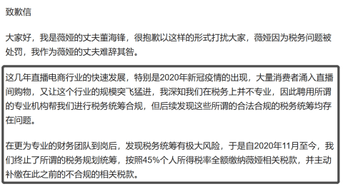 2021年底,浙江省杭州市税务局稽查局查明,网络主播黄薇(网名:薇娅)在2019年至2020年期间,通过隐匿个人收入、虚构业务转换收入性质虚假申报等方式偷逃税款6.43亿元,其他少缴税款0.6亿元,依法对黄薇作出税务处罚决定,追缴税款、加收滞纳金并处罚款共计13.41亿元。下图为薇娅丈夫董海锋的《致歉信》。