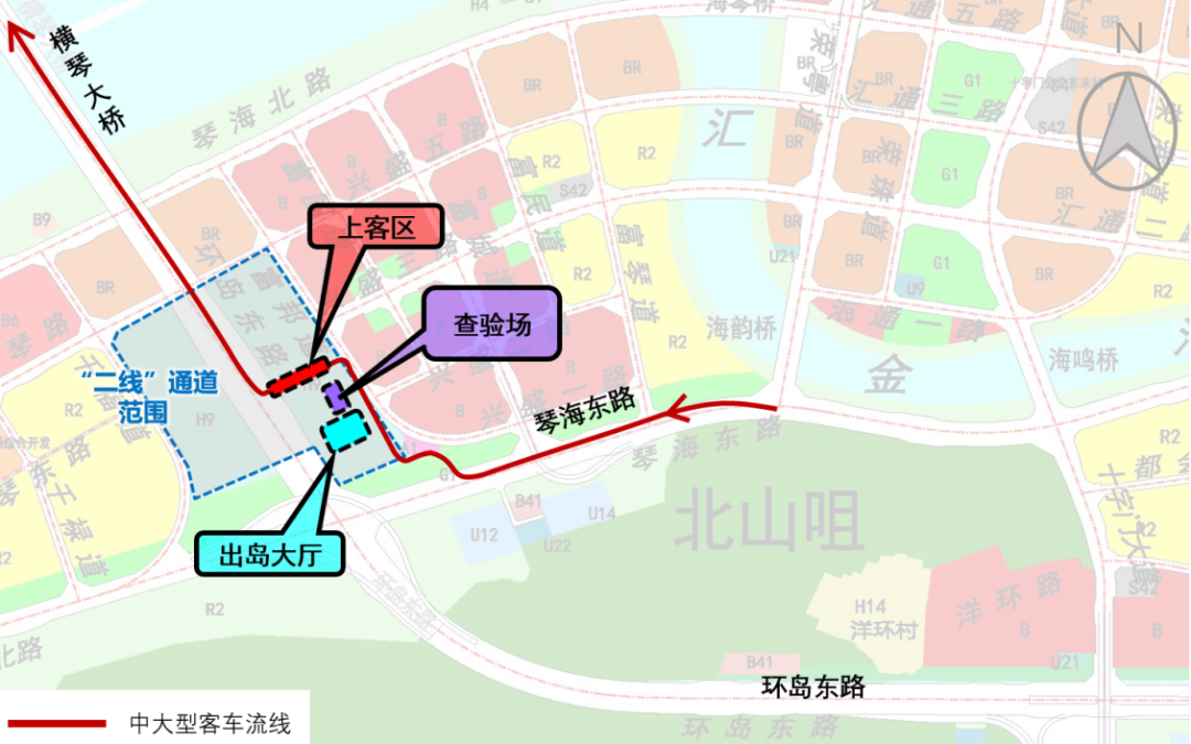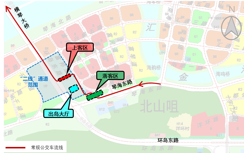 车辆经琴海东路停靠“大桥二线通道南”(暂定名)站,所有乘客携带行李物品下车,步行经出岛大厅至“大桥二线通道北”(暂定名)站乘车出岛。