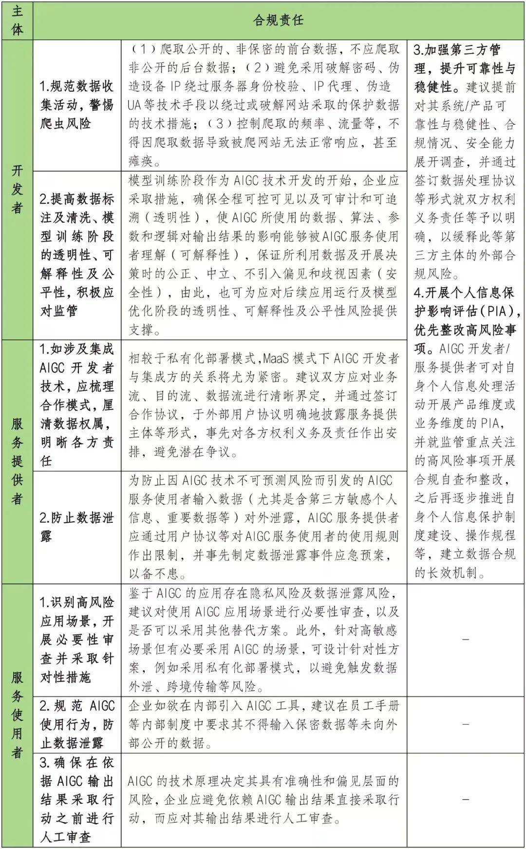 笔者根据不同主体之间权利义务的不同,梳理了AIGC全生命周期的数据合规责任,详见下表: