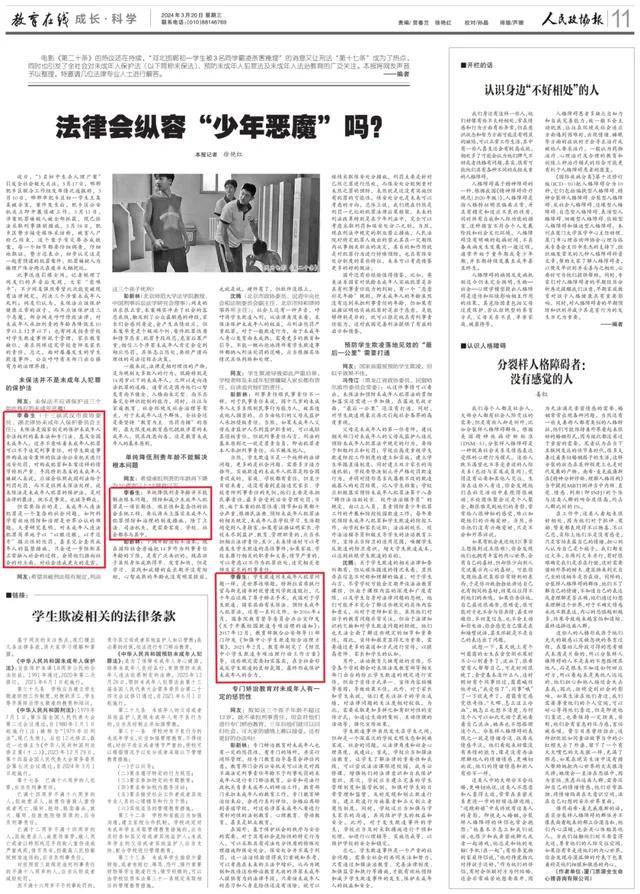 近日,“邯郸初中生遇害案”引发全社会极大关注。邯郸肥乡区联合工作组发布通报称,3月10日肥乡区初一学生王某某被杀害,肥乡区公安机关将涉案犯罪嫌疑人全部抓获并被依法采取刑事强制措施。一级律师、十三届武汉市政协委员、湖北律协未成年人保护委员会主任、京师武汉律所副主任李春生接受《人民政协报》记者采访,对网友提出相关问题进行法律解答。2024年3月20日《人民政协报》以《法律会纵容“少年恶魔”吗?》为题刊载。