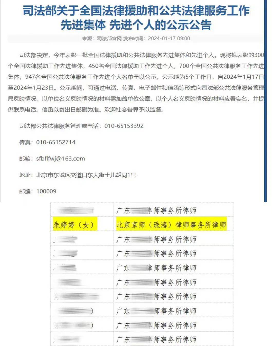 近日,司法部印发了《关于表彰全国法律援助和公共法律服务工作先进集体、先进个人的决定》,分别对270个全国法律援助先进集体及424名先进个人、723个全国公共法律服务工作先进集体及964名先进个人进行表彰。北京市京师(珠海)律师事务所党支部书记朱婷婷律师荣获“全国法律援助工作先进个人”荣誉称号。